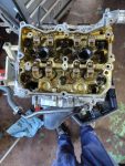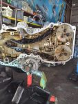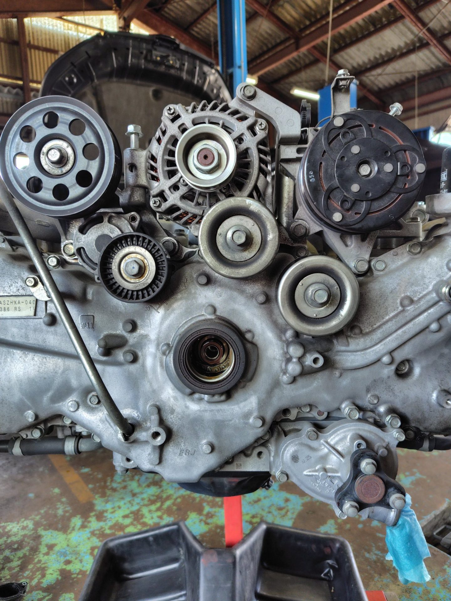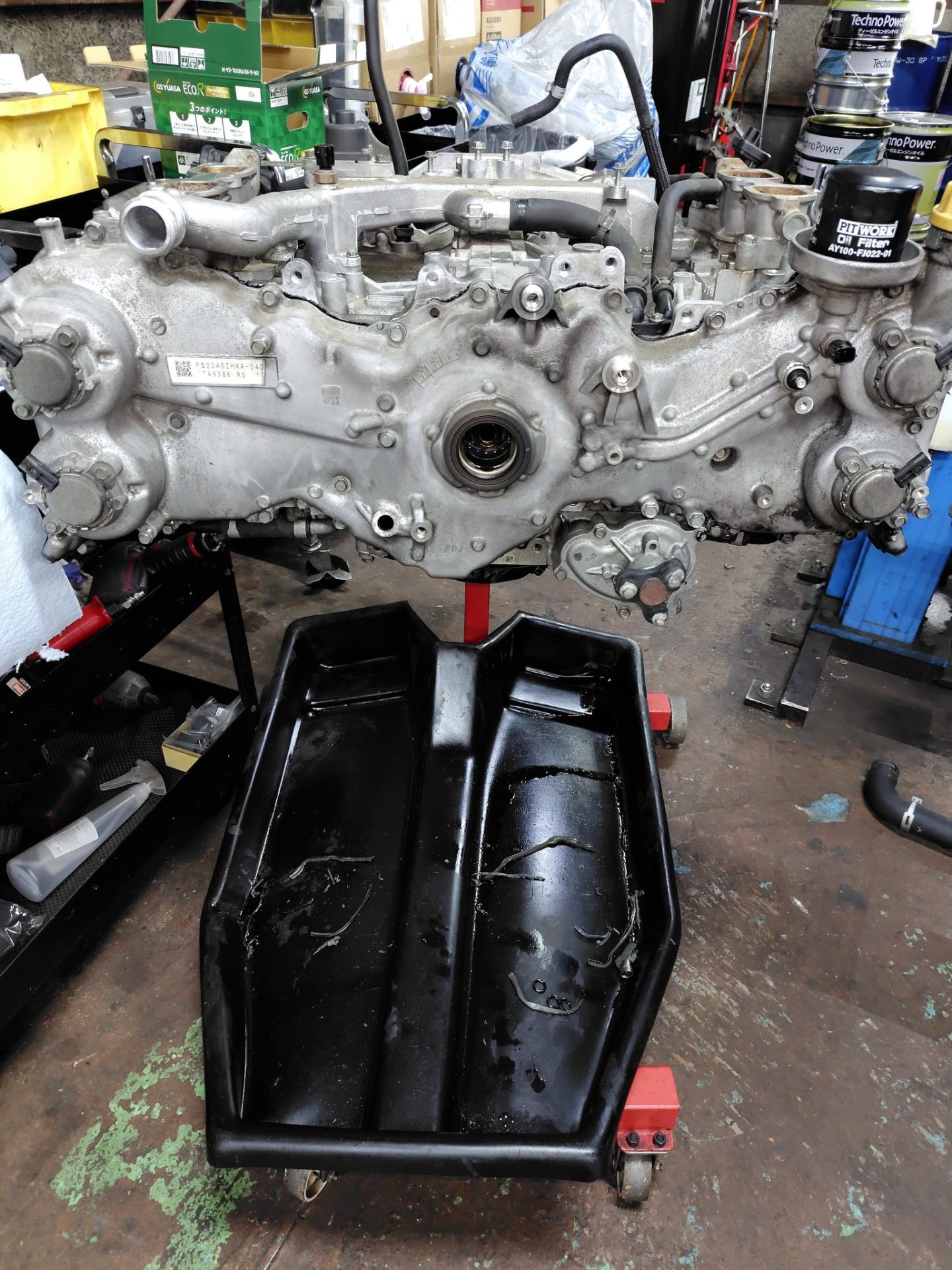 修理作業は、まず車両からエンジンを外し、分解・不良部品交換・内部洗浄・組付・車両に搭載となりました。エンジン分解中にも内部で新たなオイル漏れを発見しご相談の上、追加修理させて頂きました。