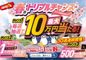 ジョイカル・春のトリプルチャンス開催! 2026年02月01日更新 【ジョイカル・春のトリプルチャンス開催!】 ただいまジョイカルでは、10週連続特別企画を実施中です。 期間中に新車リース・マイカーリースをご商談いただいたお客様の中から、抽選で毎週最大1 …続きを読む ジョイカル酒田大宮店 3/28のチラシ 2024年03月29日更新 ジョイカル酒田大宮店のチラシが配布されました! ジョイカル7MAXでは、月々1.1万円から新車に乗れる! リース期間はライフスタイルに合わせて3年・7年が選べます。 対象車種は7年型なら国産全メーカー …続きを読む